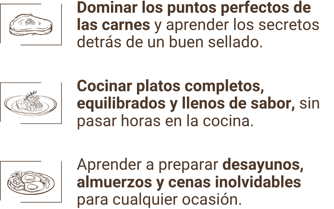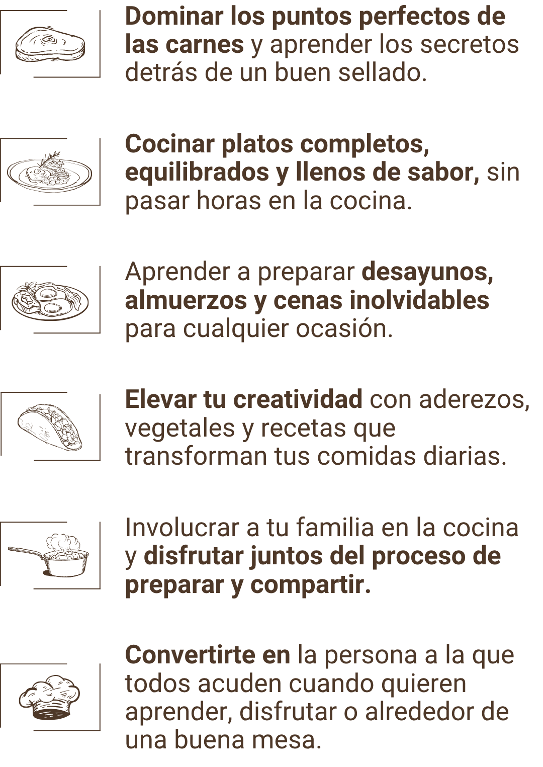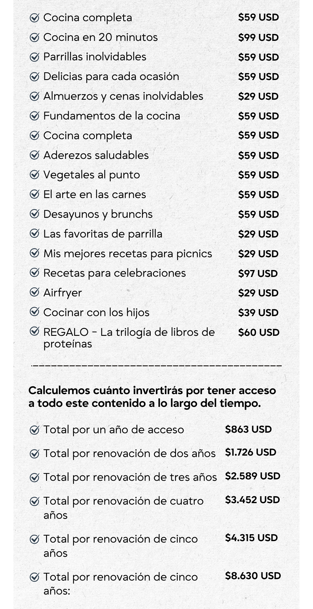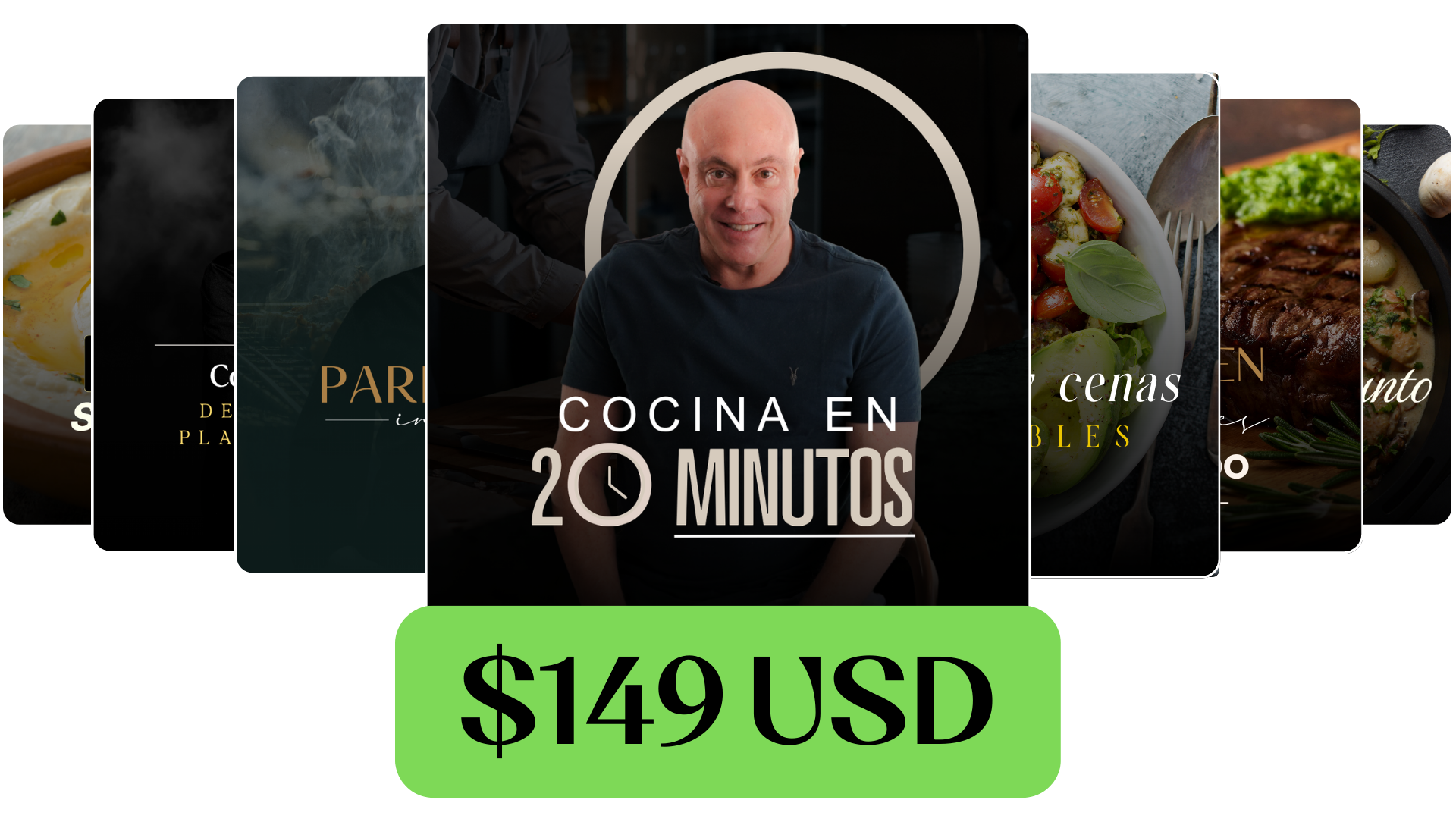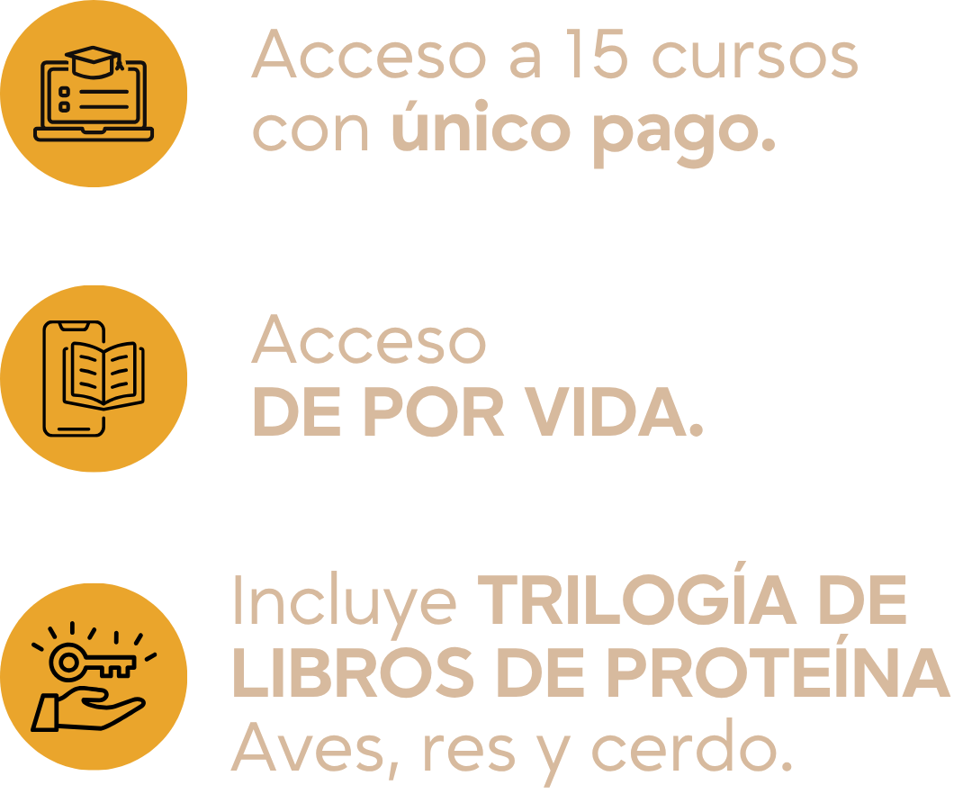 Es el acceso total a mi universo culinario. Incluye 15 cursos completos con distintas temáticas, mi trilogía de libros Res, Cerdo y Aves, y bonos especiales por tiempo limitado. Una sola compra. Acceso inmediato y de por vida.